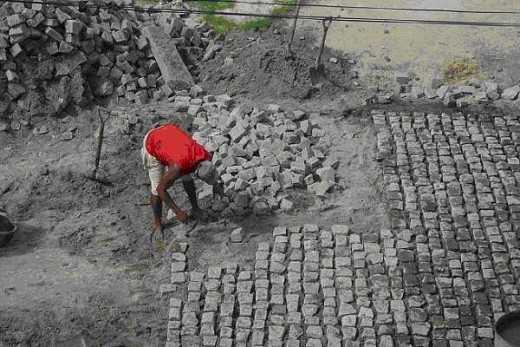 Найдите центральную линию дороги и пометьте ее, для этого поместите вдоль нее камни. Посмотрите, достаточен ли уровень песка, или, возможно, его слишком много. Сделайте всю подготовительную работу до того, как начнете выкладывать двор.
