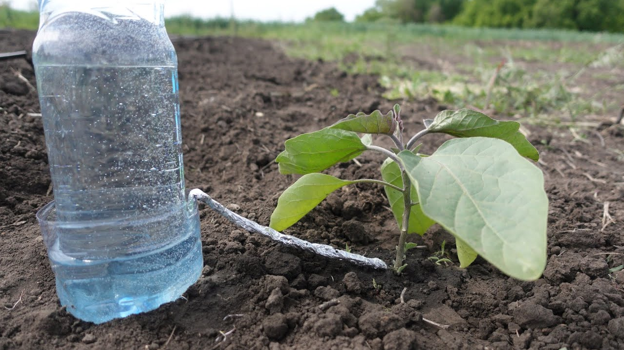 - Разместите бутылку. Расположите бутылку рядом с корневой зоной растений, приподняв ее над уровнем земли, ниже уровня листьев.