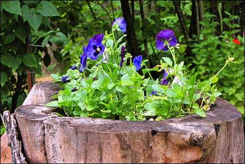Если на вашем садовом участке есть какой-то старый пень, не спешите его выкорчевывать: из него может получится необыкновенная клумба. Для этого нужно сделать в пеньке углубление, насыпать туда слой дренажа (толщина - 10-20 см, гравий или керамзит), а затем почву для цветов на 5-10 см ниже верхнего уровня пня. Полейте и высейте семена, например, настурции, и накройте пень пленкой. Если использовать вьющуюся настурцию, то такая ваша клумба будет выглядеть еще эффектнее. Можно использовать также анютины глазки или петунью (их можно купить уже цветущими) или другие цветы, на ваше усмотрение. Такая клумба будет прекрасным украшением вашего сада.