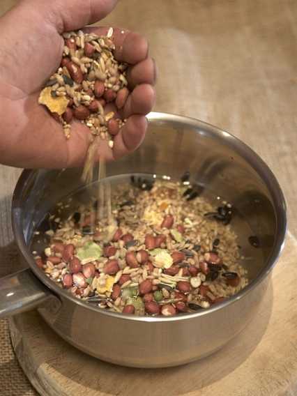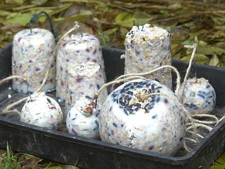 Растопите жир на слабом огне, смешайте его с зерном и выложите массу в подготовленные формочки, на дно которых предварительно поместите скрученную колечком проволочку, к которой привязана нитка — за нее вы и повесите корм на дерево.