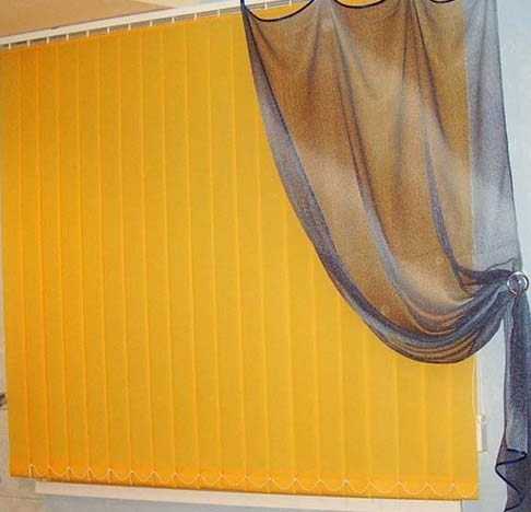 Есть жалюзи, которые могут быть подвешены на карниз, как занавес. Вертикальные жалюзи имеют вид гардины, при этом могут раздвигаться и менять угол наклона планок.