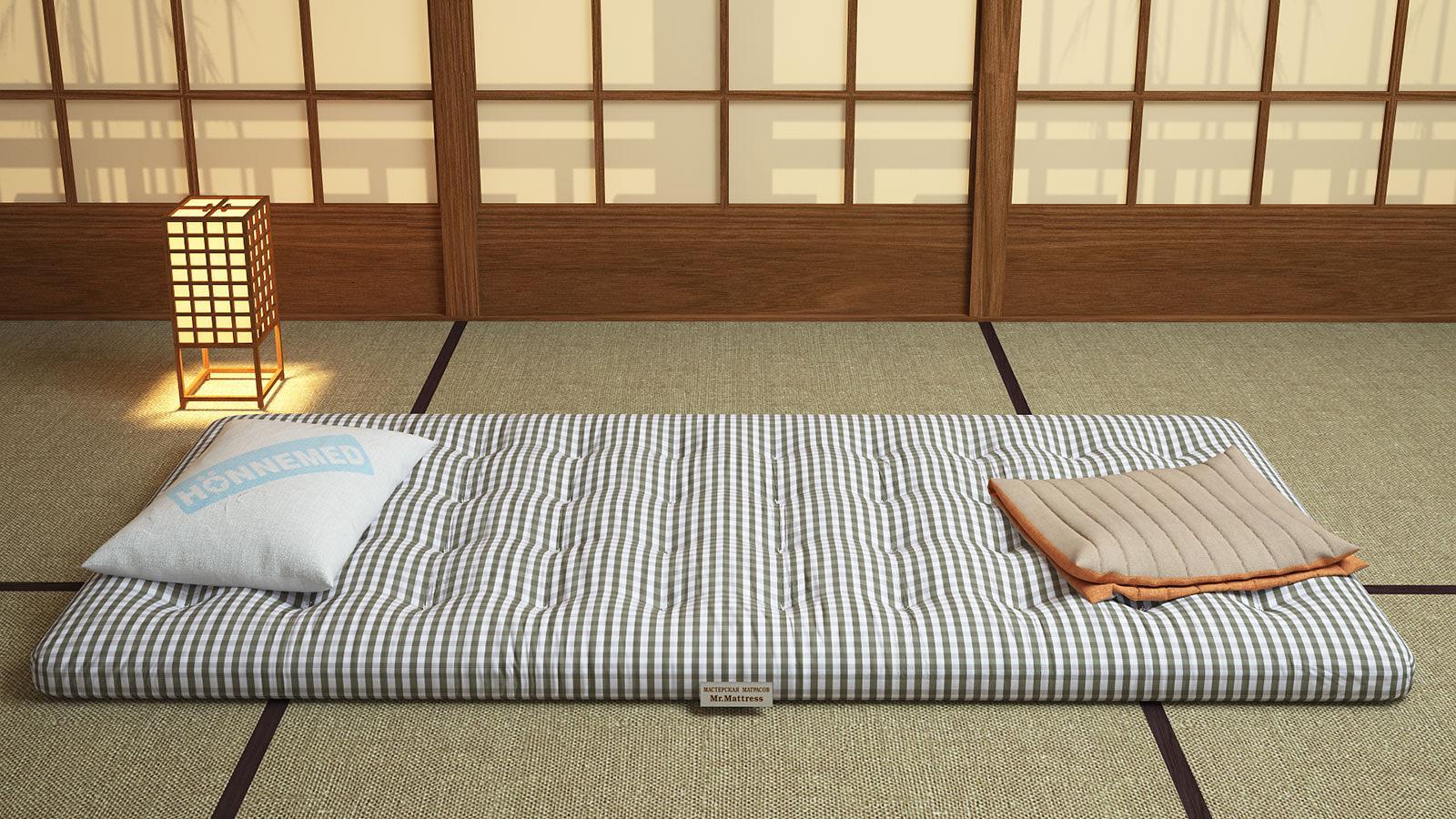 Традиционное японское место для сна — тонкий матрас футон. Впервые это изделие было сшито самураями на основе хлопка и шерсти. Хлопковая ткань выполняла роль обивки, шерсть — наполнителя. Днём такой матрас расстилался на полу прямо на циновке, изготовленной из бамбуковых пластин. Днём пространство комнаты освобождалось для тренировок, тонкий матрас убирался в шкаф или в кладовку.