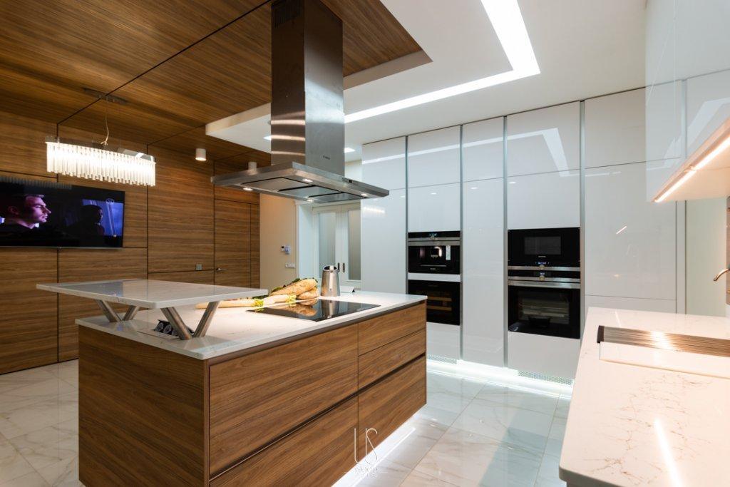 В этой кухне продумано всё: от расположения розеток до рабочих поверхностей. При этом оставлено достаточно места, чтобы не вызывать панические атаки из-за клаустрофобии, вызванной угрожающе нависшими вокруг шкафами. На оборудование внутри такой кухни тратится гораздо меньше средств, чем кажется, каждая копейка входящая в стоимость вложена максимально эффективно, этим WOODsystems и славятся.