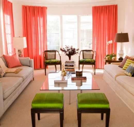 Используйте коралловый текстиль для окон в сочетании с такими же декоративными подушками, абажурами.