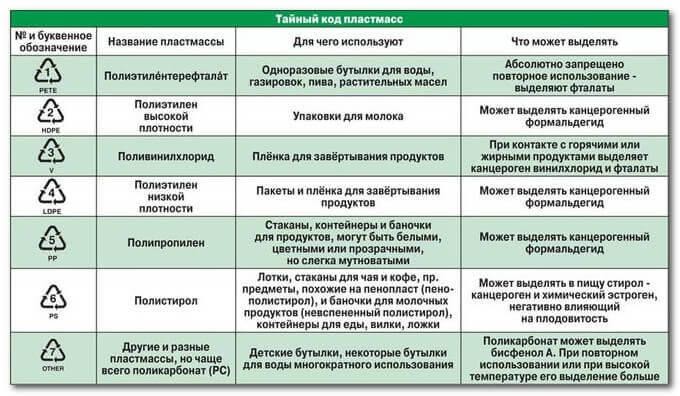 «Печка с волнами» указывает на возможность разогревания еды в контейнере, а «снежинки» обозначают то, что изделие можно ставить в морозилку. Но, главная маркировка должна указывать на вид пластика, который был использован в процессе производства пластиковой тары.