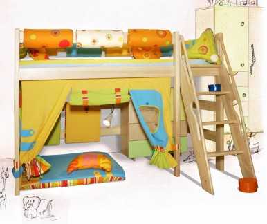 Данная модель представляет собой своеобразный комплекс, верхняя часть которого занята спальным местом для ребенка, а нижняя может включать в себя как шкафы для одежды, игрушек или белья, так и письменный стол, и даже еще одно место для отдыха. Чтобы убедиться в универсальности данного предложения, можно рассмотреть самые распространенные ситуации.