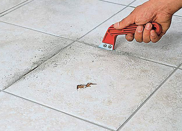 Отставшую плитку нужно снять со стены/пола и очистить её от клеевого раствора. Делать это лучше всего болгаркой, держа её под углом и без нажима. Если замене подлежит треснувшая (надколотая) плитка, то первым делом необходимо проделать бороздку по периметру, удалив затирку. Лучше всего для этого подойдёт специальный набор для очистки швов, однако можно воспользоваться ножом. Хотя затирка не слишком твёрдая и затруднений быть не должно, будьте осторожны, чтобы не повредить края соседних плиток.