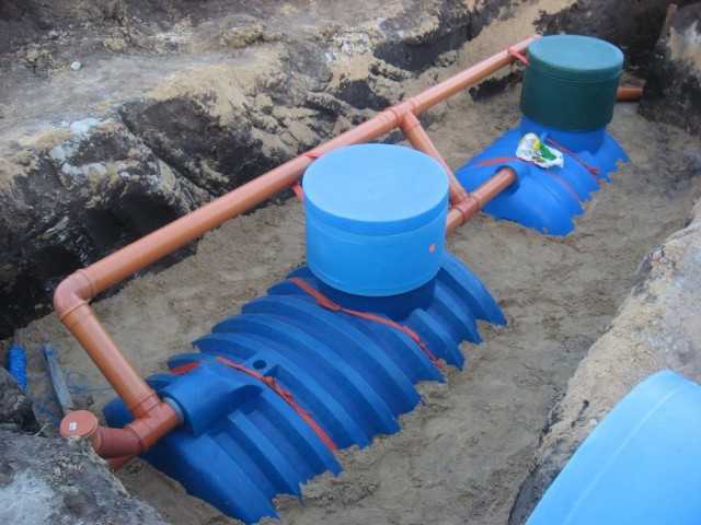 - Установки почвенной фильтрации. В этом случае стоки самопроизвольно опускаются в очистное сооружение (например, пластиковый септик), где происходит процесс отстаивания. Такая система может провести фильтрацию вод больше чем наполовину, и удалить из них все загрязнители и химикаты. Септики также разделяться по материалу изготовления: сталь, железобетон и пластик.