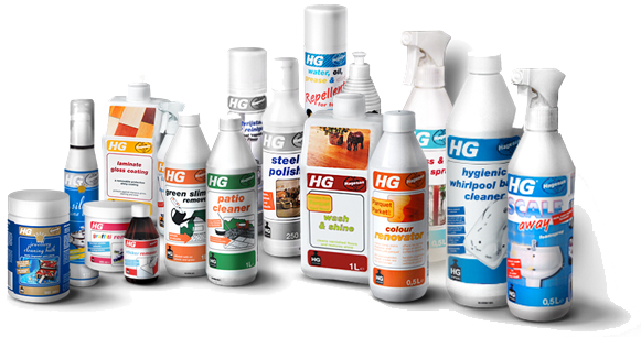 Фирма HG разработала различные средства, такие как: средство для очистки душевой и ванной, для применения в посудомоечных машинах, для удаления накипи, для очистки холодильников и отдельно для микроволновых печей, для пластика и стали, зеркал, мрамора, ламината и ковров и многие другие.