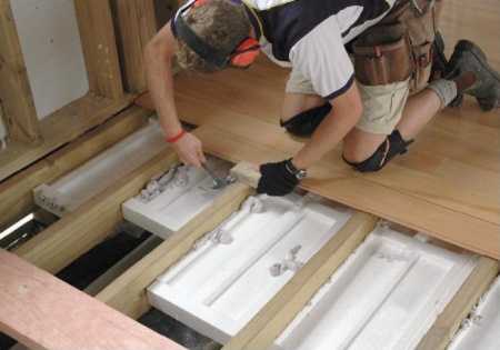 Для начала пол на лоджии следует покрыть гидроизоляционным материалом, как вариант, рубероидом. После чего с помощью саморезов установить обрешетки (подойдут деревянные бруски). Далее, в образованное между обрешетками пространство, уложить минеральную вату. Её необходимо натягивать и, в случае необходимости, укладывать в 2-3 слоя.