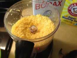 Натереть один кусок хозяйственного мыла, используя терку из нержавеющей стали или кухонный комбайн.
