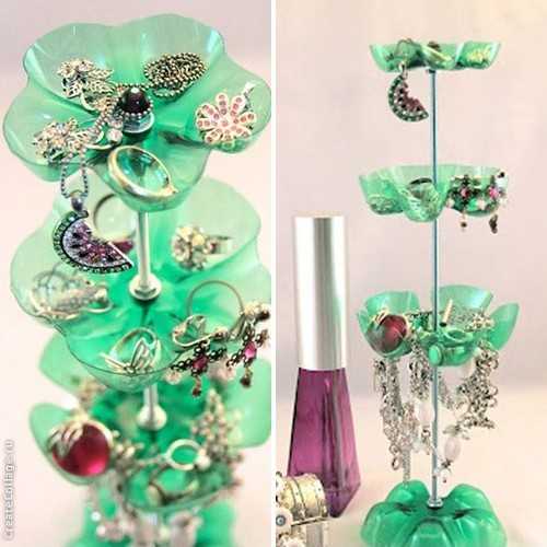 Проявив смекалку можно создать удобный органайзер для хранения бижутерии. Например, из старых пластиковых бутылок Для этого вам понадобится несколько донышек разного диаметра с обработанными зажигалкой краями, достаточно крепкий стержень, гайки и шайбы, отверстия которых будут совпадать с выбранным стержнем. Остается только проделать в пластиковых донышках отверстия по середине и нанизать их на ось закрепляя шайбами и гайками.