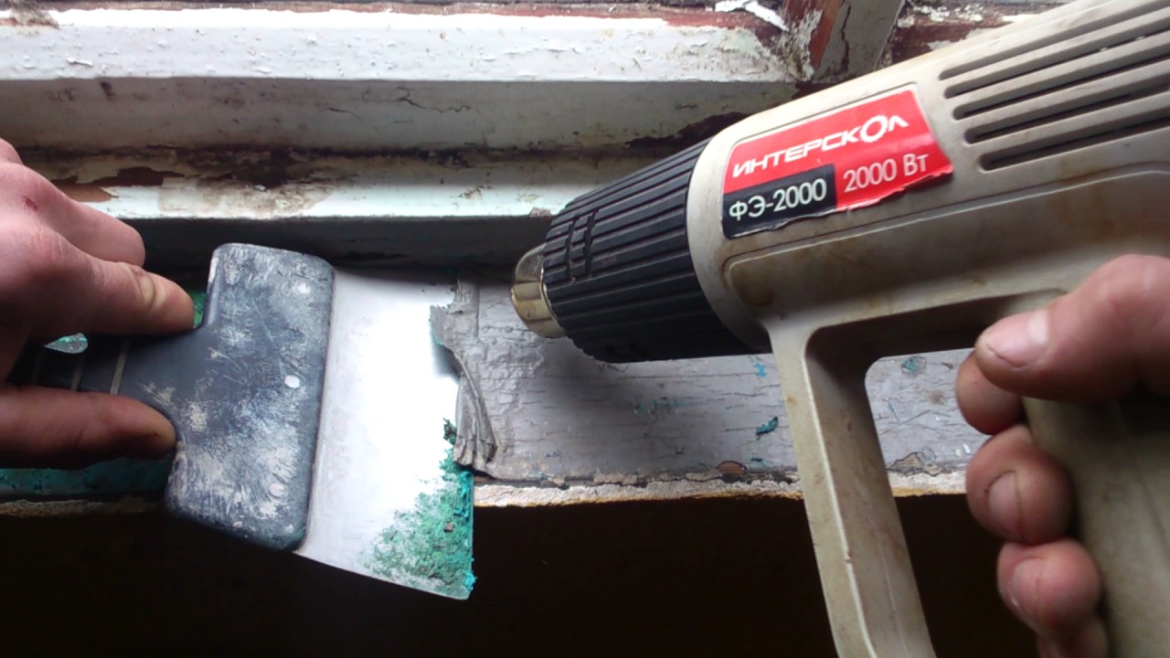 Убираем феном старую краску. Сначала очищая деревянные рамы, потом переходим к откосам, а заканчиваем подоконниками. Данный процесс нужно выполнять в хорошо проветриваемом помещении, придерживаясь всех правил техники безопасности.