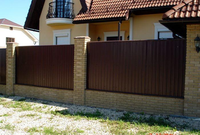 - для заборов и ограждений. Стоимость такого материала невелика, а установка не требует специальных навыков. Заборы из профилированных листов служат не один десяток лет, стойкие к перепадам температур, отлично защищают от посторонних взглядов территорию и выглядят красиво. Огромный выбор полимерных покрытий и цветов профнастила для ограждений дает возможность домовладельцу установить забор с декоративными качествами, например выбрать цвет аналогичный цвету кровли. Дизайн профильных листов для забора также очень разнообразный;