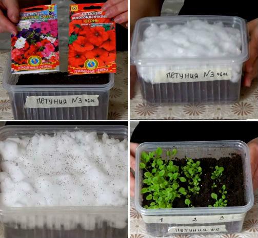Выберете светлое, теплое местечко для своих будущих цветов. Самая благоприятная температура для проращивания семян, это 23-25 градусов тепла. Всходы будут заметны уже на 4-5 день. Хотим предложить вам еще один немного иной метод. Сначала заполняем на половину контейнер грунтом, далее выкладываем снег почти до самого верха и только потом засеваем семена по всей поверхности снега. Снег дает возможность видеть всю равномерность засева семян. Не бойтесь засеивать густо. Преимущества данного способа те же, что и в первом случае. Также накрываем емкость крышкой и отправляем в теплое светлое местечко прорастать. Дражированные семена по поверхности снега засевать не советуем. Рекомендуем всем попробовать этот замечательный, надежный и простой способ посева семян петунии.