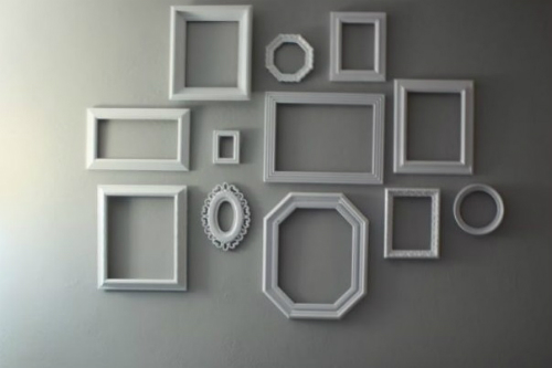 Для тех, кто мыслит не стандартно, есть отличная идея. На стене однотонного цвета гармонируют пустые рамки в один цвет, но разные по величине.