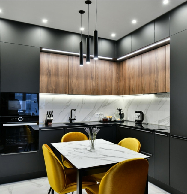 Для кухни важно установить несколько вариантов освещения. Если вы сделаете только верхнее потолочное освещение, то пространство визуально уменьшится (а кухни часто небольшие по размеру), появятся тени. Кроме того, не всегда будет комфортно готовить или заниматься другими кухонными делами. Итак, должно быть общее освещение, можно точечное. Над рабочей зоной обязательно установите подсветку.