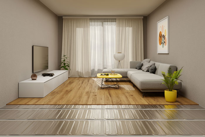 - простая установка. Алюминиевые нагревательные элементы лучше устанавливать под ламинат, в таком случае можно исключить перегрев напольного покрытия, что особенно важно для древесно-композитной основы. Все подключения выполняются производителем, во время монтажа необходимо только присоединить провода к термостату;