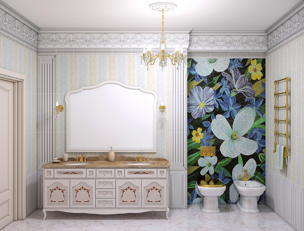 Мозаичные композиции могут располагаться на стенах, полу и даже потолке, становясь настоящим произведением искусства в интерьере.