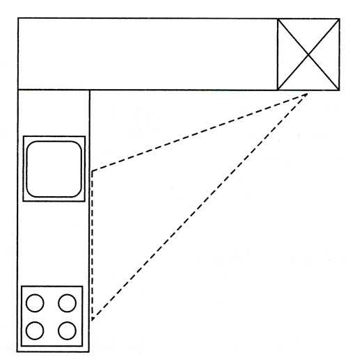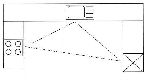 В идеале, раковину нужно располагать в центре этого треугольника, а расстояние от нее до плиты должно быть 120— 180 см, а от раковины до холодильника — 120— 210 см.