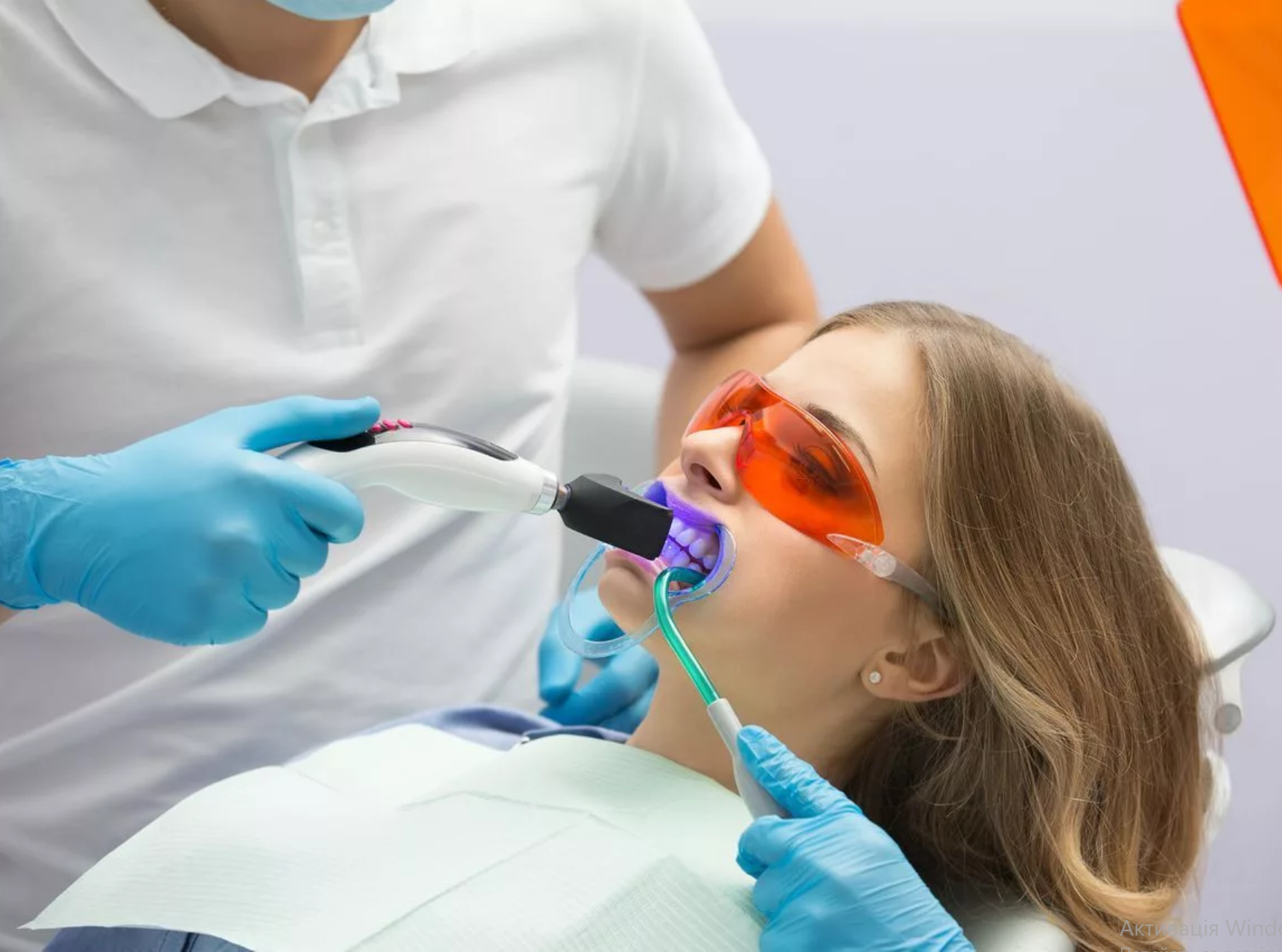 - Световая активация: В некоторых случаях для ускорения процесса отбеливания используется специальная лампа или лазер, которым светят на зубы.