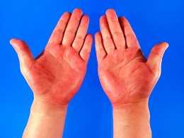 Если печень плохо функционирует, она плохо удаляет токсины из организма, в результате чего кровеносные сосуды в руках и ногах расширяются, появляются красные пятна на ладонях.