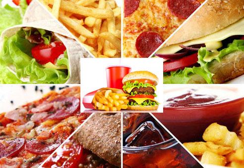 Пицца, гамбургеры, хот-доги, картофель фри, жареная курица, жареный сыр, бутерброды, мясные деликатесы, блинчики и пончики являются хорошими примерами быстрого питания.