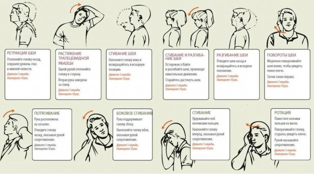 1. Подбородок опустите к шее. Поверните голову сначала 5 раз вправо, а затем 5 раз влево.