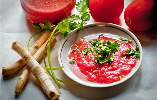 Пропускаем через мясорубку помидоры, потом чеснок (его можно пропустить в чесночницу). Теперь прокручиваем корни хрена.