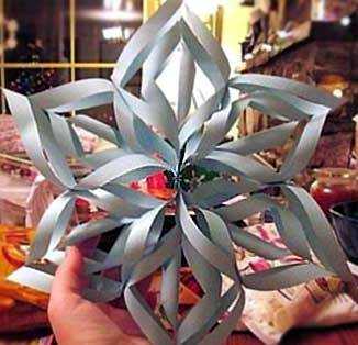 Сделать объемную снежинку из бумаги не намного сложнее, чем просто вырезанную бумажную снежинку, в то же время выглядит она гораздо эффектнее.