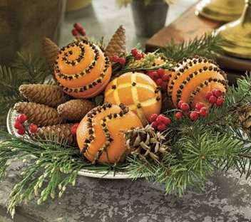 Традиционная новогодняя композиция из шишек, веточек с ягодами, палочек корицы и апельсинов, утыканных гвоздикой (такие ароматные шары называются "помандеры").