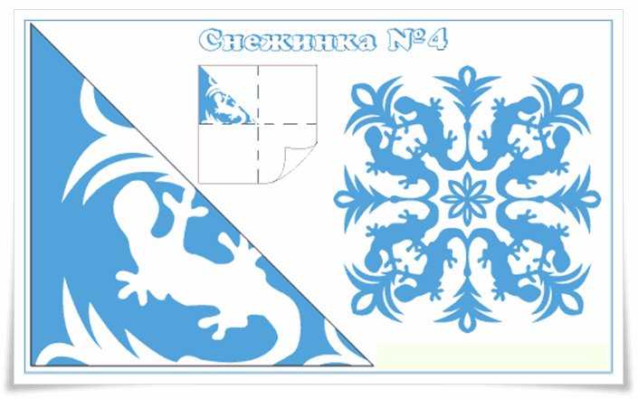 Складываем бумагу как показано не рисунке, а затем вырезаем узоры, чтобы получить в итоге бумажные снежинки.