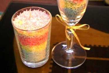 Натираем воск на терке. Затем помещаем длинную тонкую свечу в центре бокала и осторожно плотно засыпаем ее полученной восковой стружкой. Если вы используете просто фитиль, то засыпаем стружкой его. Можно чередовать разные цвета стружки, или перемешать все в однородную массу.