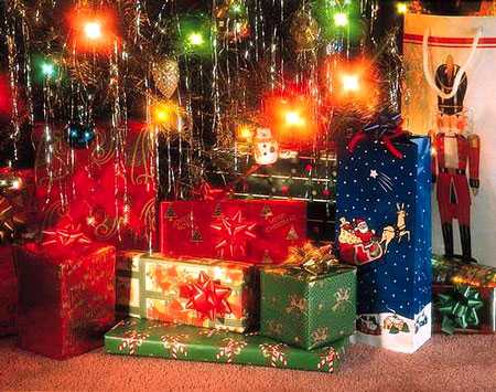 Идеально подходит для семей с маленькими детьми рождественские носки, заполненные леденцами, конфетами, шоколадом, и небольшими игрушками. Сшить такой носок можно из кусочков ткани (см. фото) и украсить лентами, пуговицами, снежинками и т. п.