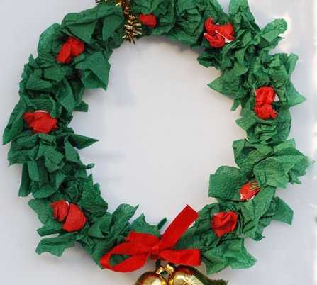 Теперь нарезаем салфетки на кусочки и наклеиваем их на основу. А кусочками красной бумаги украшаем, привязываем ленточку и колокольчики.