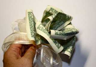 Материалы: бумажные деньги (по 3 купюры для каждой розы); лента или тесьма; проволока для стебля; полоски зеленой бумаги или специальная флористическая лента.