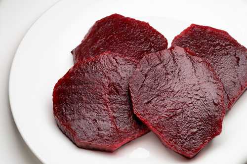 Очищенную и промытую свеклу варить четыре часа, затем нарезать ломтиками и сложить плотно в банки. Залить прокипяченным и охлажденным рассолом (вода, соль и уксус). Брожение длится от 10 до 12 дней, хранить при температуре от +5 до +10 градусов.