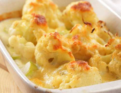Сложите цветную капусту в смазанную форму для выпечки и вылейте смесь со сметаной. Выпекать в умеренной духовке 10-15 минут. Затем выньте и посыпьте тертым сыром. Верните в духовку и выпекайте до румяной корочки.