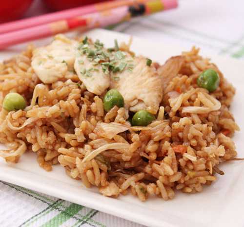 Продукты: рис - 1 стакан, лук репчатый - 1 головка, овощи - 1/2 пакета замороженных, куриное филе, грибы - 4-5 больших, колбасы — несколько ломтиков, помидоры - 1 или томатный сок, масла - для заправки, соль, черный перец, тмин.