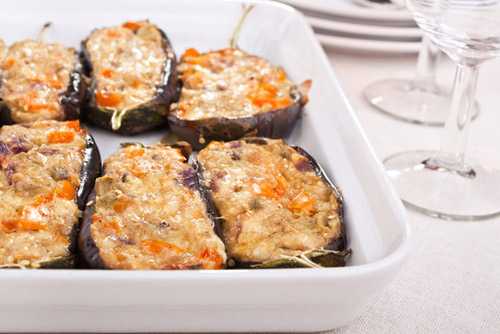 Разрезать баклажаны в длину, посолите и дайте им постоять, затем промыть теплой водой и жарить в горячем масле. Готовые баклажаны раскладываем в форму и заполняем творогом, выдавливаем чеснок и посыпаем мелко нарезанной петрушкой. Сверху кладем кусочки помидора, посыпаем тертым сыром и запекаем в микроволновой печи или в духовке. Когда блюдо готово, украшаем еще тертой морковкой и петрушкой.