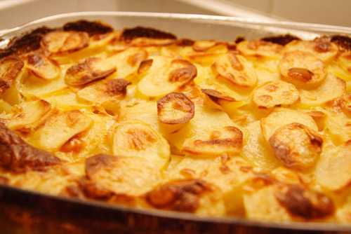Сложите картофель в форму для выпечки и залейте молочной смесью: подогретая сметана, мелко нарезанный плавленый сыр, чеснок и укроп. Выпекать. В конце посыпать тертым твердым сыром.