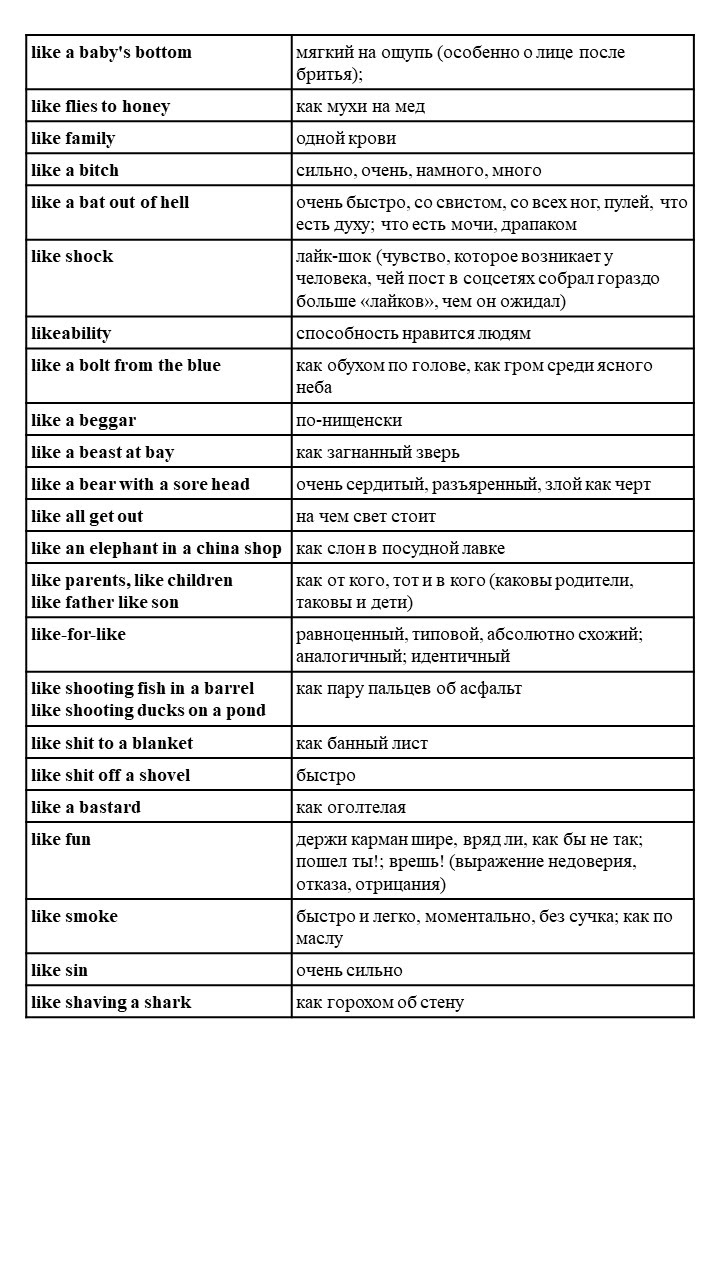 И напоследок в тему like - полезная подборка выражений с ним в таблице ниже.