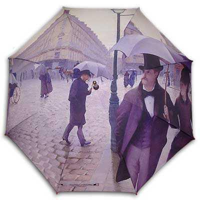 Ещё один необычный зонт-тросточка – это зонтик южно корейского бренда HelloRaincat. Его необычность состоит в том, что дизайнеры зонта поставили перед собой задачу сделать такой цветной принт на зонтике, чтобы он подошёл бы исключительно мужчинам. И они не прогадали, напечатав на куполе картину Гюстава Кайботте (французский художник импрессионист) «Улицы Парижа в дождливую погоду», на которой изображены галантные джентельмены с усами, в цилиндрах, фраках и плащах и, конечно же, с зонтами.