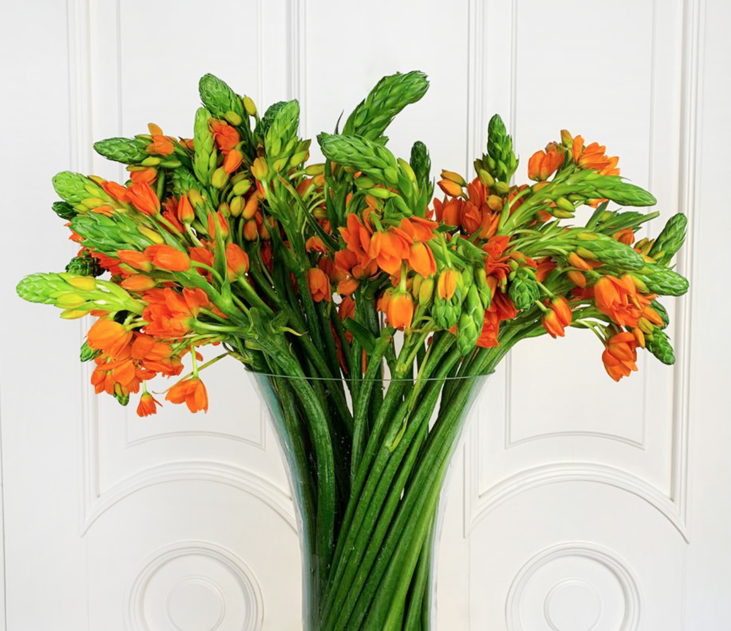 Орнитогалум (он же птицемлечник) - представитель далекой субтропической флоры. Поэтому неудивительно, что смотрится он в цветочных магазинах необычно и выделяется на фоне других растений. Высота стебля цветка внушительная - до 40 до 85 см, листья на стебле отсутствуют. Цветет птицемлечник долго за счет постепенно раскрывающихся бутонов на верхушке кисти. Поэтому стоять в воде, не утрачивая своей изначальной презентабельности, цветок может аж до 4 недель. Чаще всего, лепестки окрашены в мягкие, практически пастельные тона - кремовый, желтый, оранжевый, а также есть белые цветы.