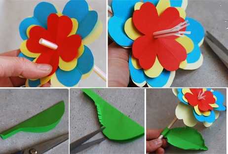 Затем конец трубочки аккуратно нарезается тонкими полосками, и расправляется руками. У нас получились тычинки. Из зеленой бумаги вырезаем листок, который приклеиваем к трубочке. Можно придать ему объем — сделать сгиб вдоль листка, нарезать бахрому по краю и расправить ее руками.