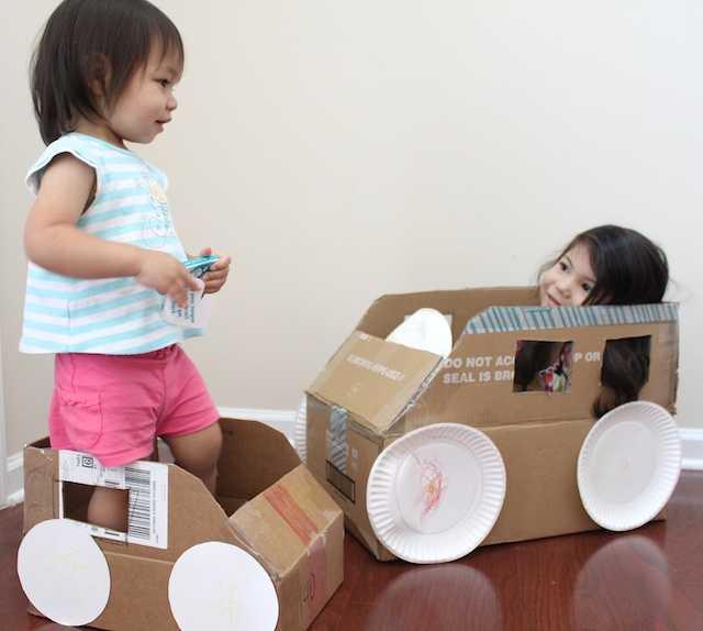 В каждом доме найдутся коробки из под техники, посуды или других товаров. Их можно не выбрасывать, а сделать забаву для малышей - машины.