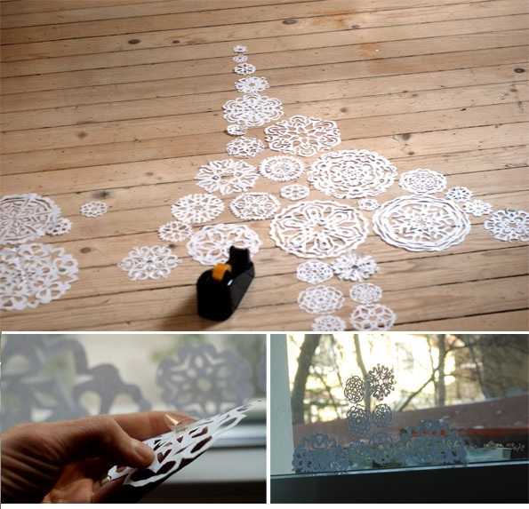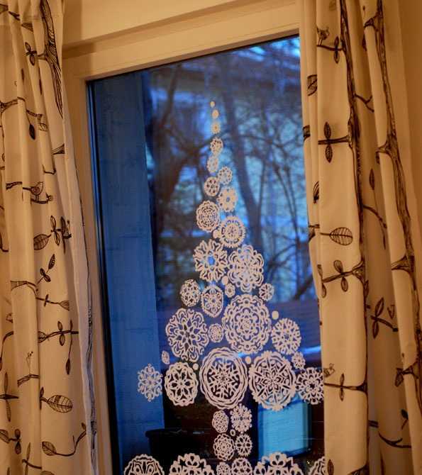Подготовленные снежинки расположите на полу в форме дерева, а затем перенесите полученный рисунок на окно, прикрепив снежинки с помощью двухстороннего скотча.