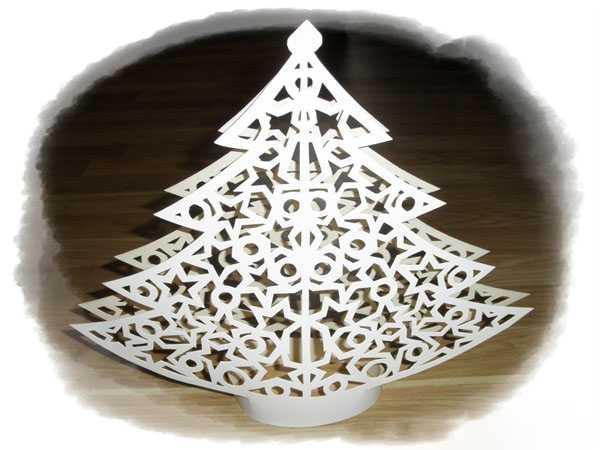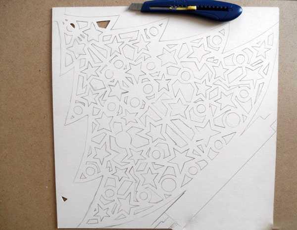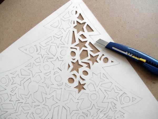 С помощью канцелярского ножа сделай узор на елке — сначала внутри и лишь затем переходи к вырезанию контуров ножницами.