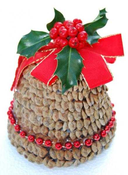 Сверху прикрепи рябину, еловую веточку и обвяжи всю эту красоту ярко-красной лентой. Чтобы сделать игрушку сияющей, нанеси на листочки шишек лак для ногтей с блестками.