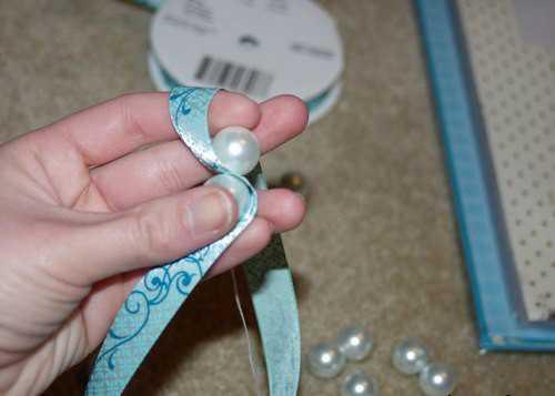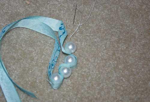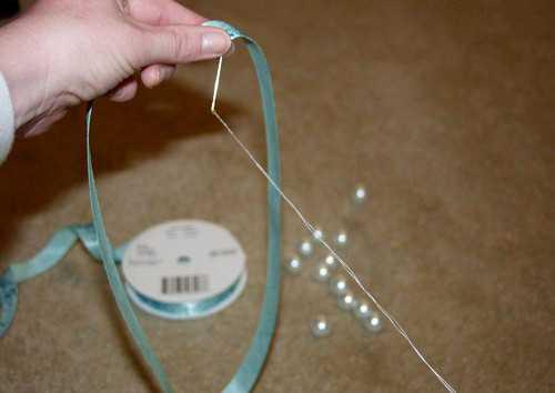 3. Возьмите бусинки и проденьте их ниткой. Две соседние бусинки должны располагаться по обеим сторонам ленты.